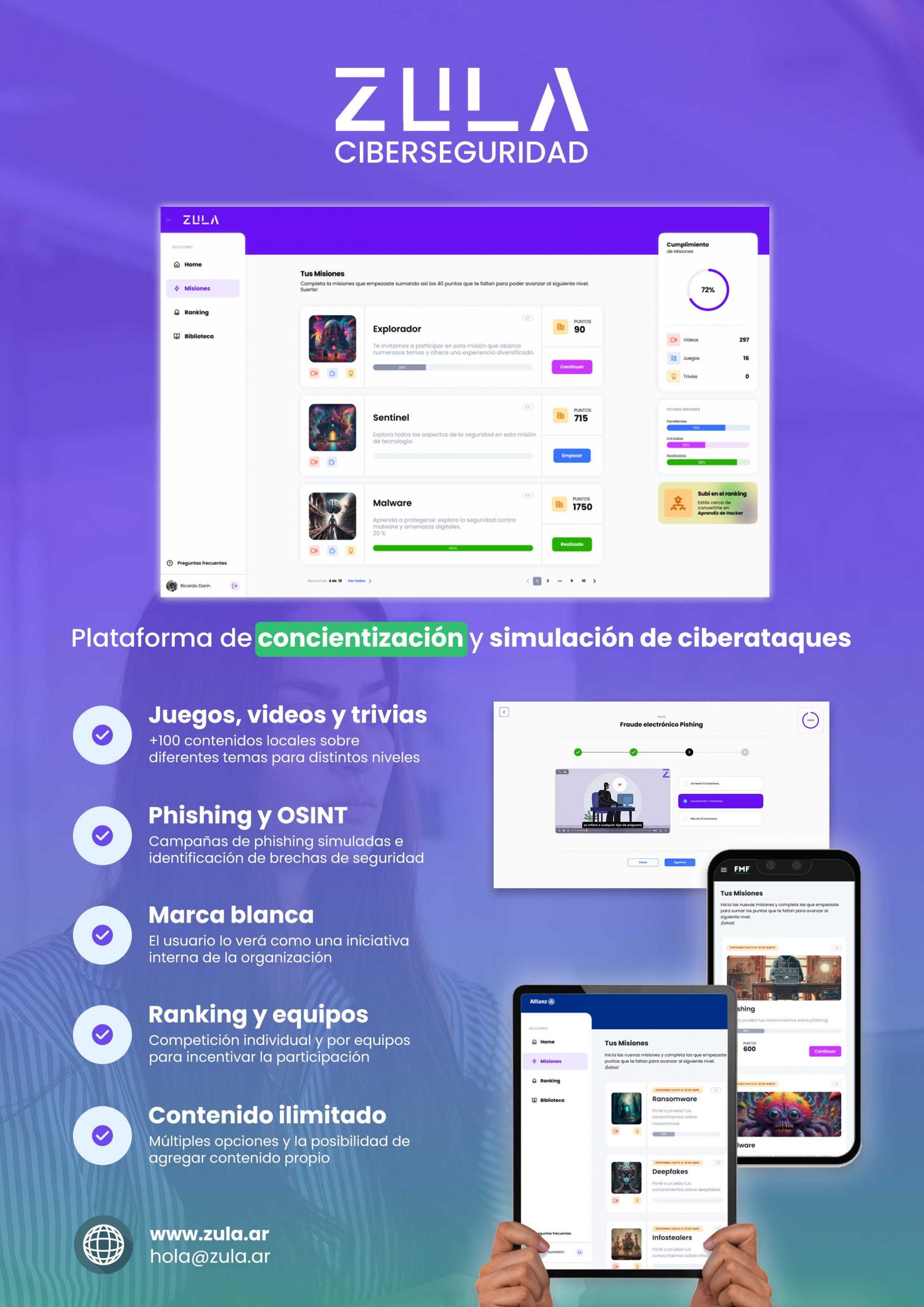 En nuestro perfil de LinkedIn puedes encontrar material educativo, comercial, de eventos y novedades sobre ZULA, la industria de ciberseguridad y del nicho de concientización.