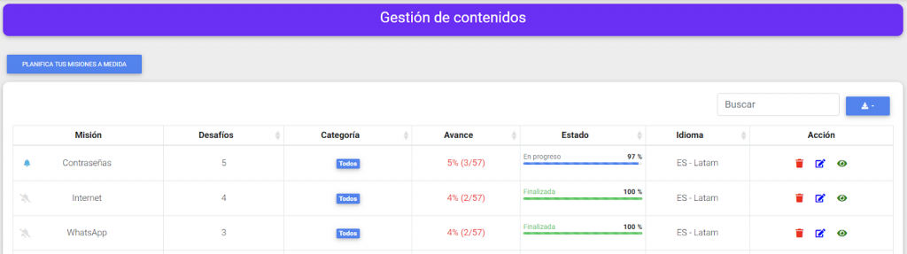 Previsualizar misión. En ella se pueden ver las estadísticas de los usuarios y una tabla detallando el progreso de cada uno. A su vez, se pueden administrar las notificaciones en el caso de no haberlo hecho anteriormente.