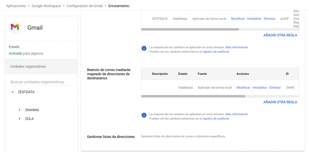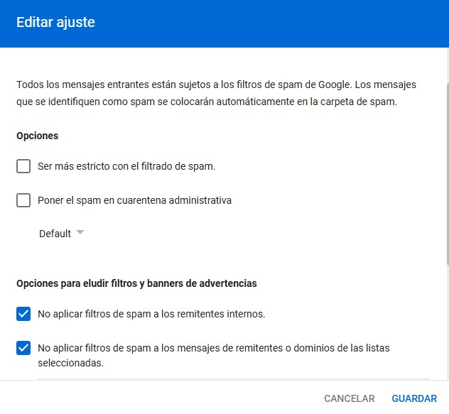 En este apartado se configura la lista blanca de dominios y direcciones permitidas en Gmail.
