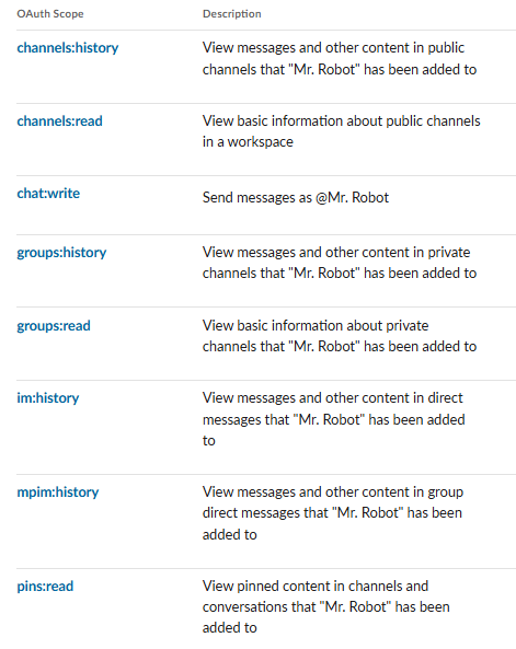 - Creación y configuración de un Bot en Slack con permisos personalizados