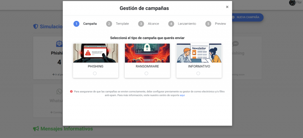 – Campaña: Seleccione el tipo de campaña (Phishing / Informativo / Ransomware)