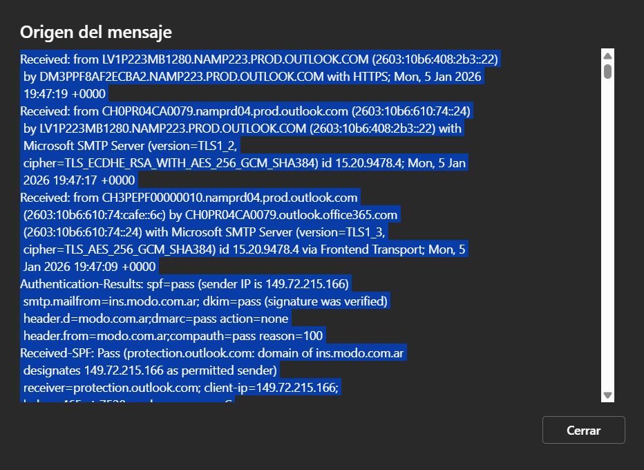 4. Se abrirá una ventana con el contenido original del mail (headers + HTML)