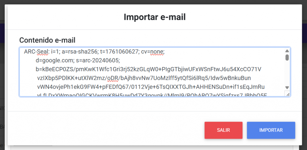 3. Pega lo copiado en el recuadro “Contenido e-mail” y haz click en el botón “Importar”