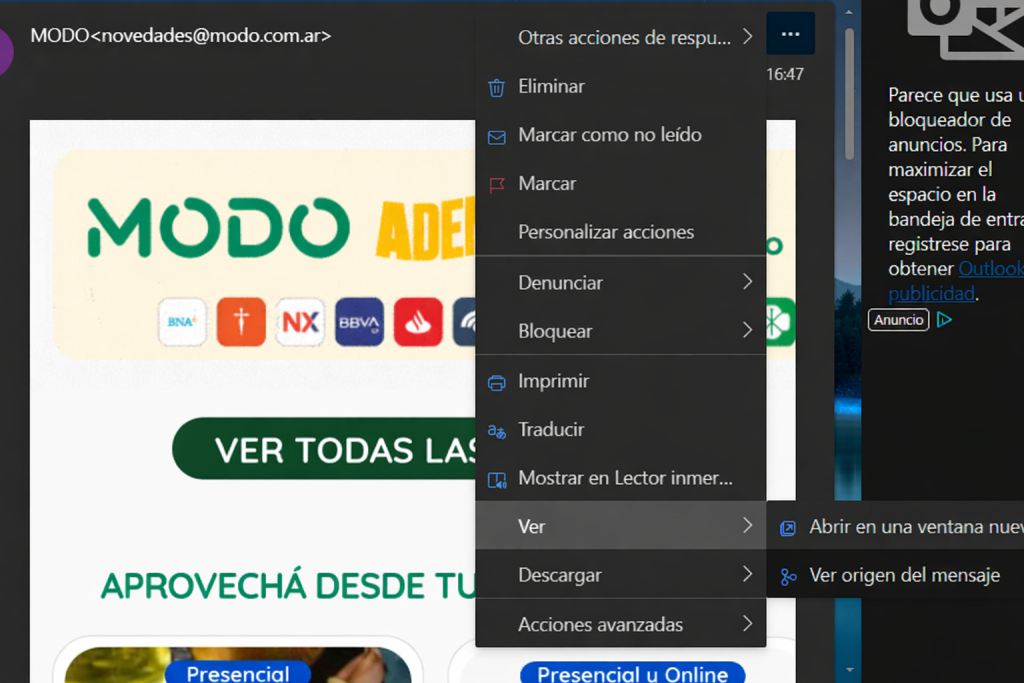 En el caso de Outlook de escritorio, el acceso al HTML no siempre es tan directo y suele venir codificado, por lo que recomendamos utilizar Outlook Web para este tipo de pruebas.