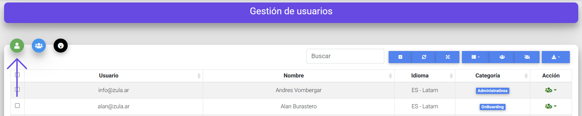 - Para crear un usuario haz click en el icono verde 👤
