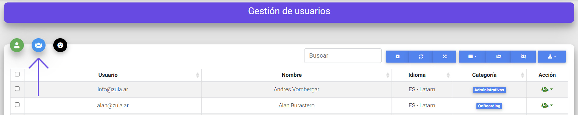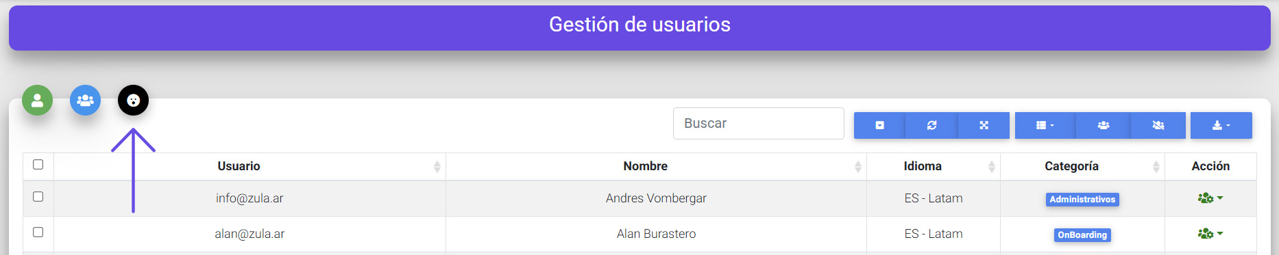- Para importar usuarios masivamente haz click en el icono azul 👥