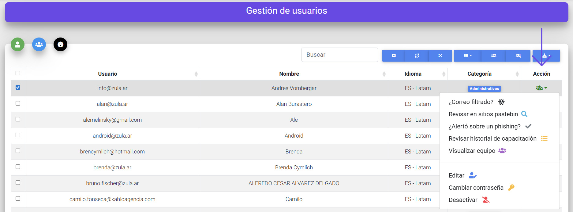 Gestión de usuarios: acción