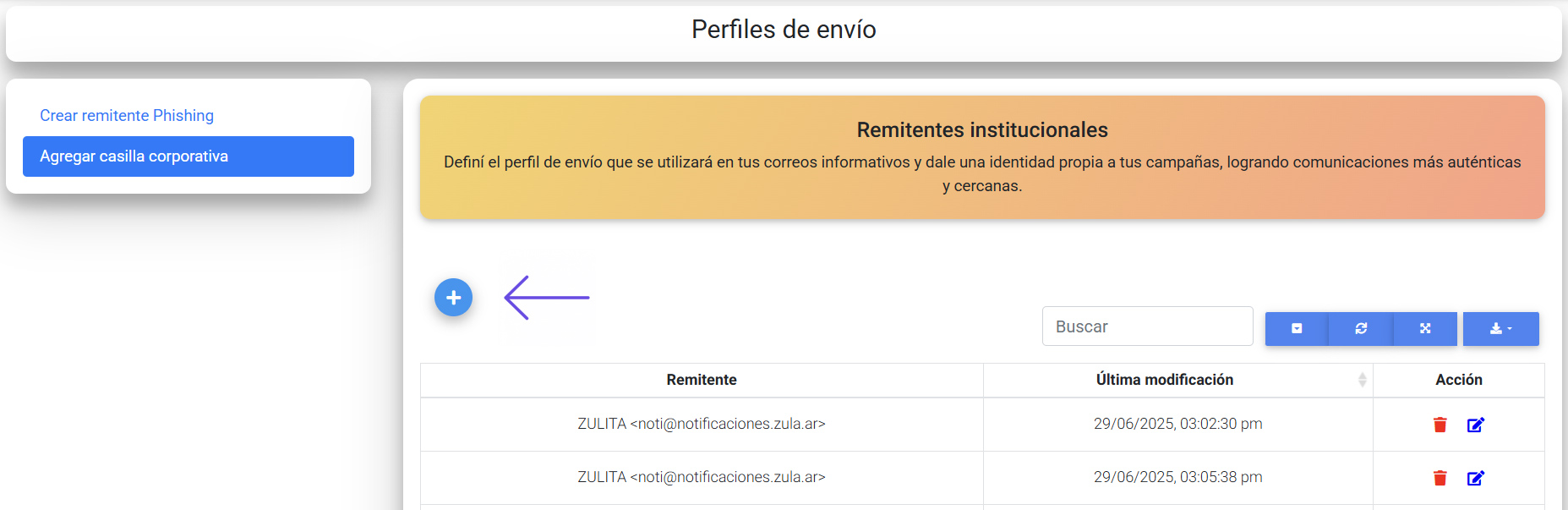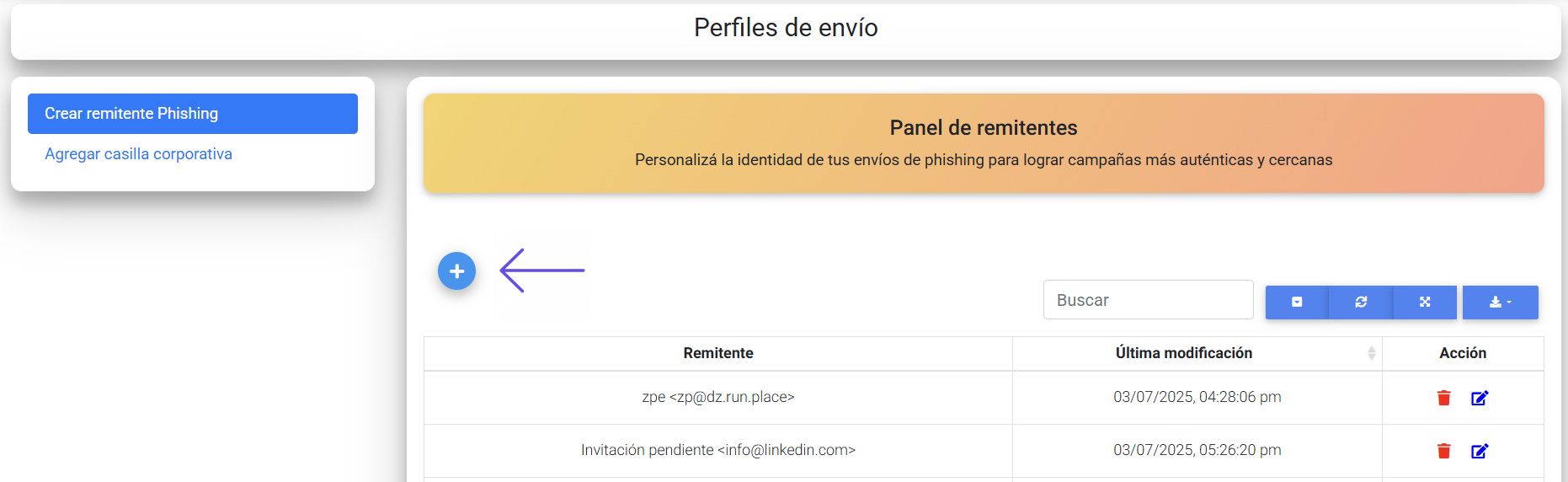 - Para crear un remitente personalizado para correos de Phishing, haz clicken el ícono azul ➕.