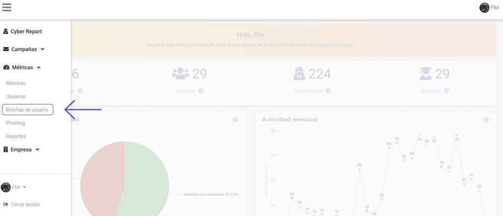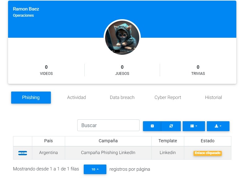 Acción: se muestra el perfil del usuario junto con el detalle de todas sus actividades y niveles de exposición. Desde esta vista podes consultar las campañas de phishing en las que hizo clic, su actividad dentro de la plataforma (videos, juegos y trivias), los sitios donde su correo fue filtrado (data breach), los Cyber Report generados y su historial completo de interacción.