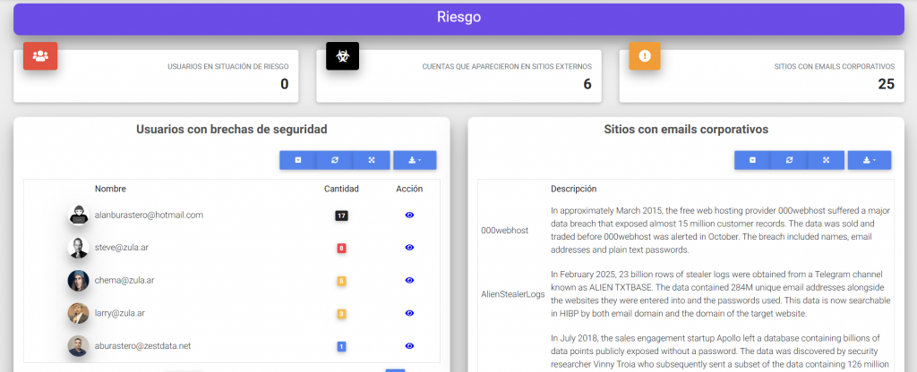 Acción: previsualización de la fecha, el nombre y la descripción de los sitios en los que el correo fue vulnerado.